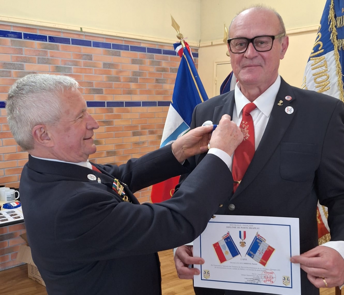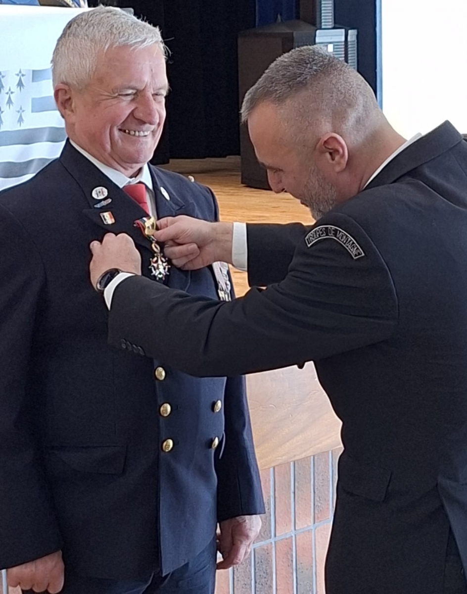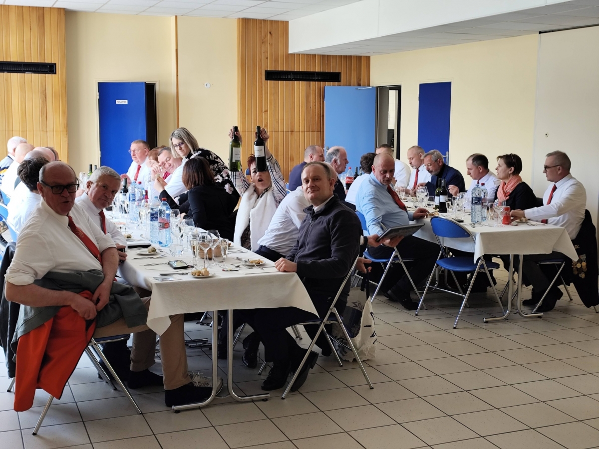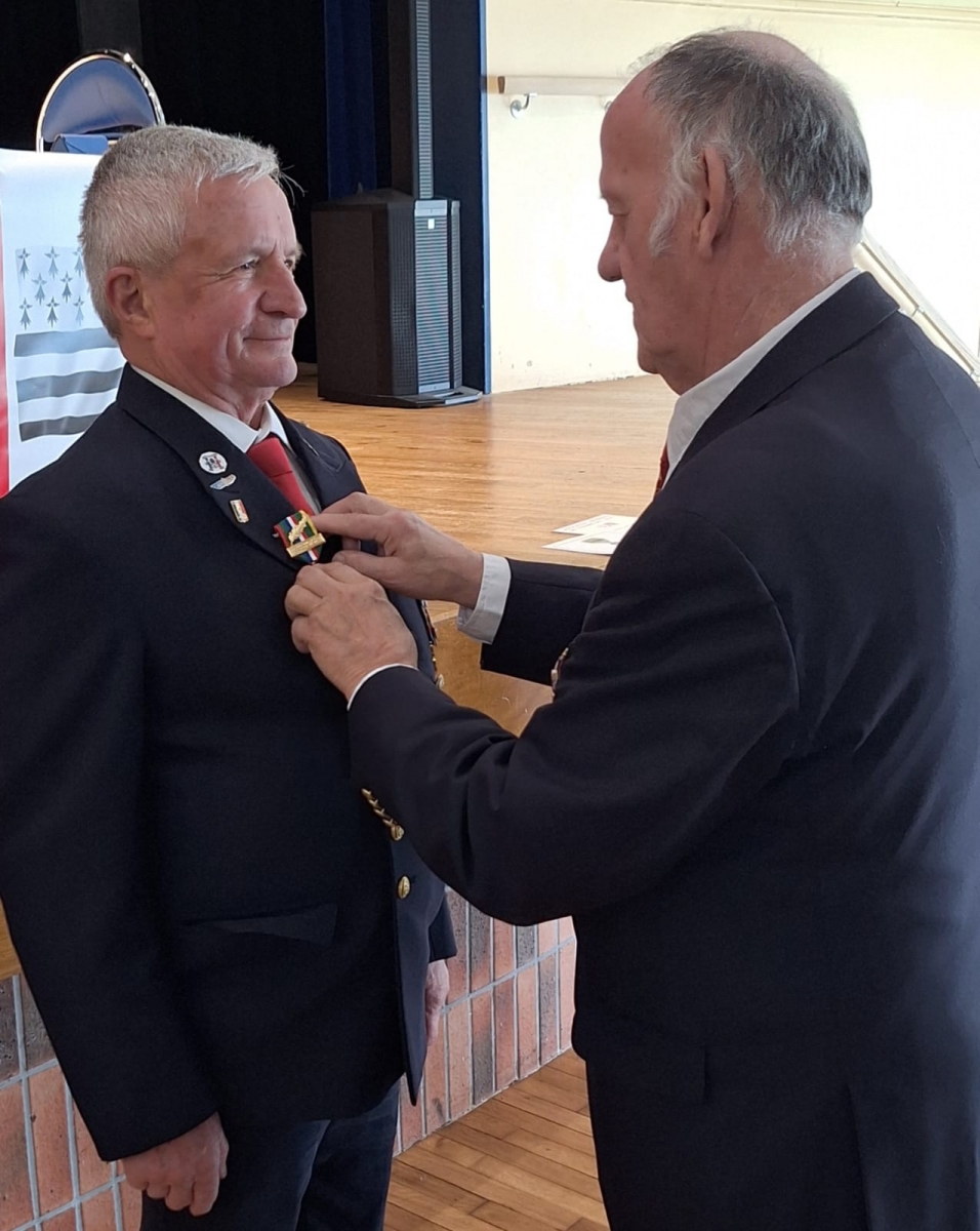 Avant de passer à table et avant la photo de groupe, le président national Alain COUPERIE remettait la médaille du Civisme et du Dévouement palme Or numéro 4024 au président régional Bretagne Fabien BOURNIER sous les applaudissements de l'assemblée .